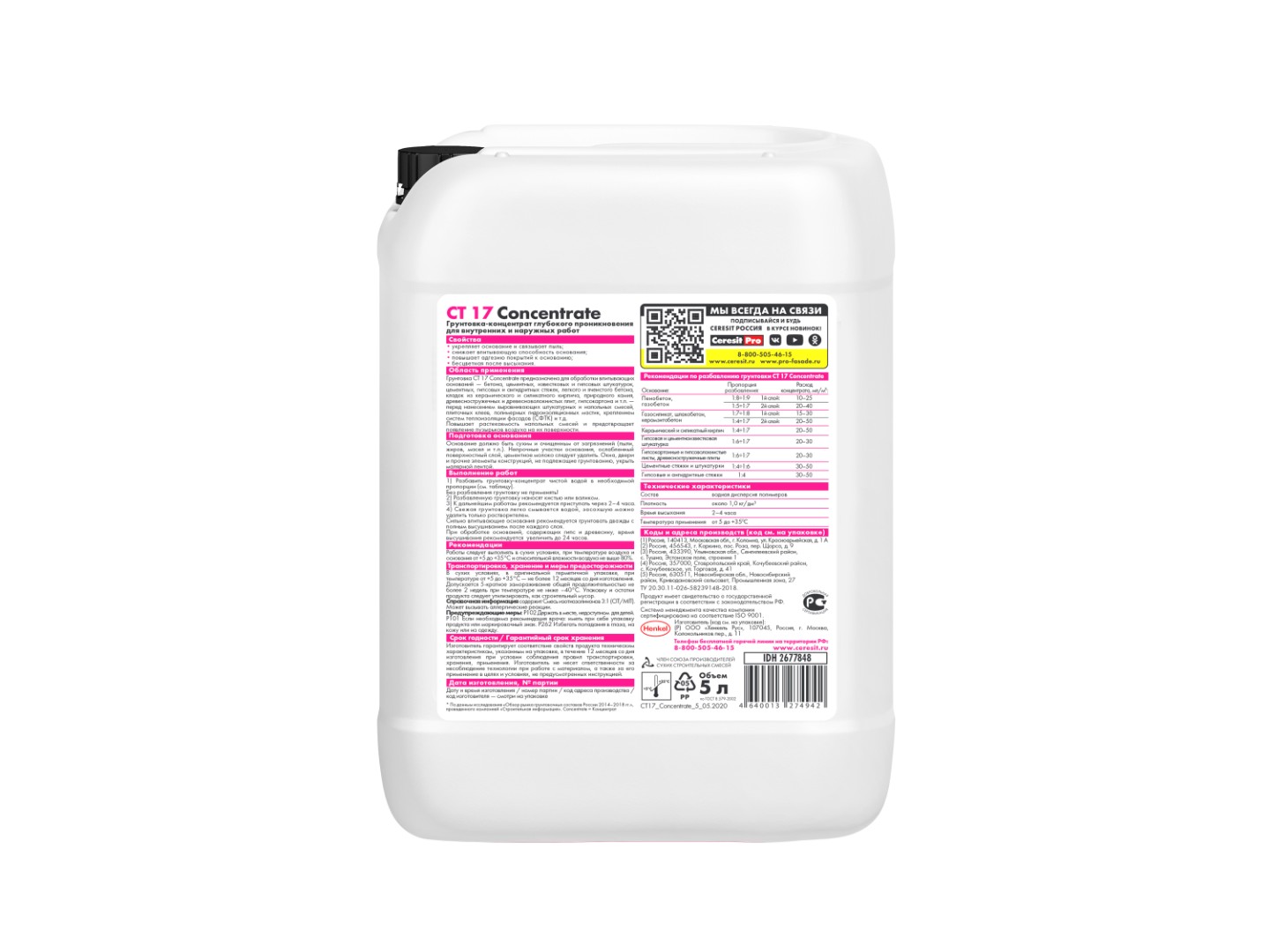 Грунтовка CT 17 Concentrate предназначена для обработки впитывающих, сильно впитывающих и непрочных оснований перед нанесением выравнивающих штукатурных и напольных смесей, плиточных клеев, полимерных гидроизоляционных мастик, а также при креплении систем фасадной теплоизоляции (СФТК).