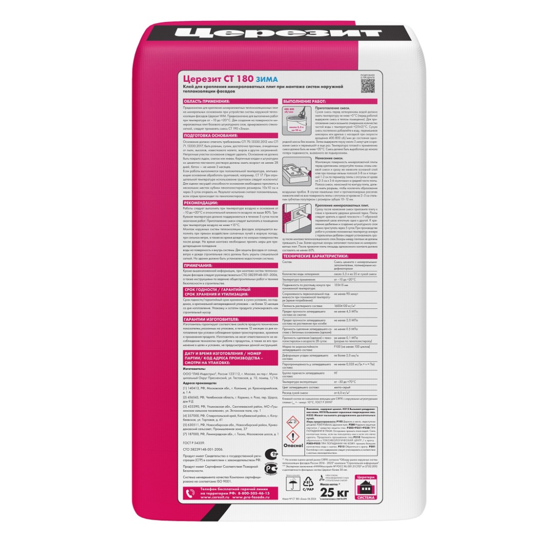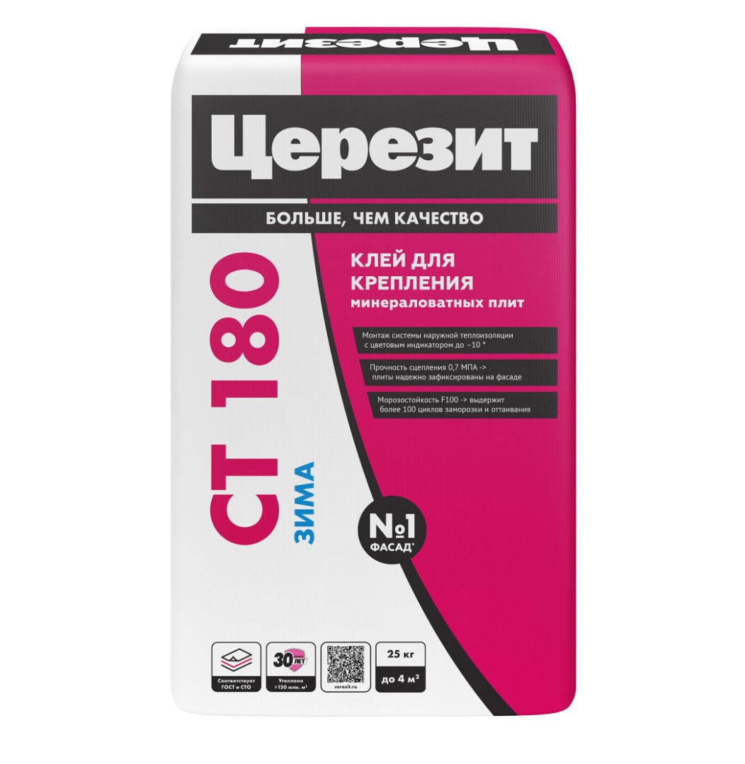 Клеевая смесь CT 180 предназначена для крепления минераловатных теплоизоляционных плит на минеральных основаниях при устройстве систем фасадных теплоизоляционных композиционных (СФТК) с теплоизоляционным слоем из минераловатных плит (Ceresit WM).