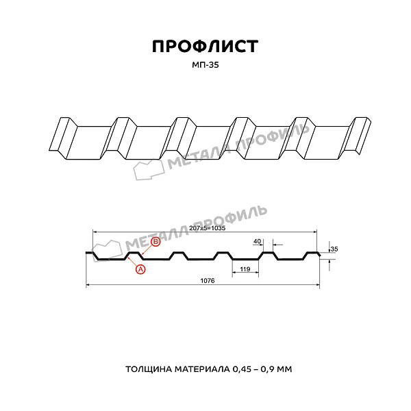Профлист МЕТАЛЛ ПРОФИЛЬ МП-35x1035-B (PURMAN-20-9005-0,5) широко применяется для монтажа профилированного листа. Изначально он представляет собой лист оцинкованной стали с покрытием. Толщина металла с цинковым и декоративно-защитным слоем — 0.5 мм. После проката на специальном оборудовании сталь принимает волнообразный вид. Жёсткость профилированного листа гораздо выше плоского.Профиль МП-35: