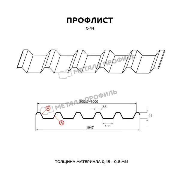Самый рельефный профиль марки С в ассортименте Металл Профиль. Данная пометка несёт информацию, что это «стеновой» материал, впрочем разделение металлопроката по области применения довольно формально. С-44 используется как в промышленном, так и в частном строительстве. Волна этого профиля имеет глубину 44 мм, выбрать толщину стального листа вы сможете сами – от 0,45 до 0,8 мм. С-44 отличается хорошей несущей способностью и улучшенной жёсткостью. Часто, подверженных повышенным нагрузкам. Например: гаражи, торговые точки, бытовки, ограждения для частных территорий, промышленных зон и стройплощадок, несъёмная опалубка, кровли скатных крыш. Материал С-44 отличается стойкостью к образованию ржавчины, к влиянию агрессивной среды, климатическим изменениям. Обладает одновременно высокой прочностью и небольшим весом. Также он легко и понятно монтируется. Продолжительность службы С-44 может длиться до 50 лет, в зависимости от выбранного покрытия. Полимерный слой создаёт металлопрокату элегантный вид и дополнительные характеристики.Покрытие PureTech Mat: